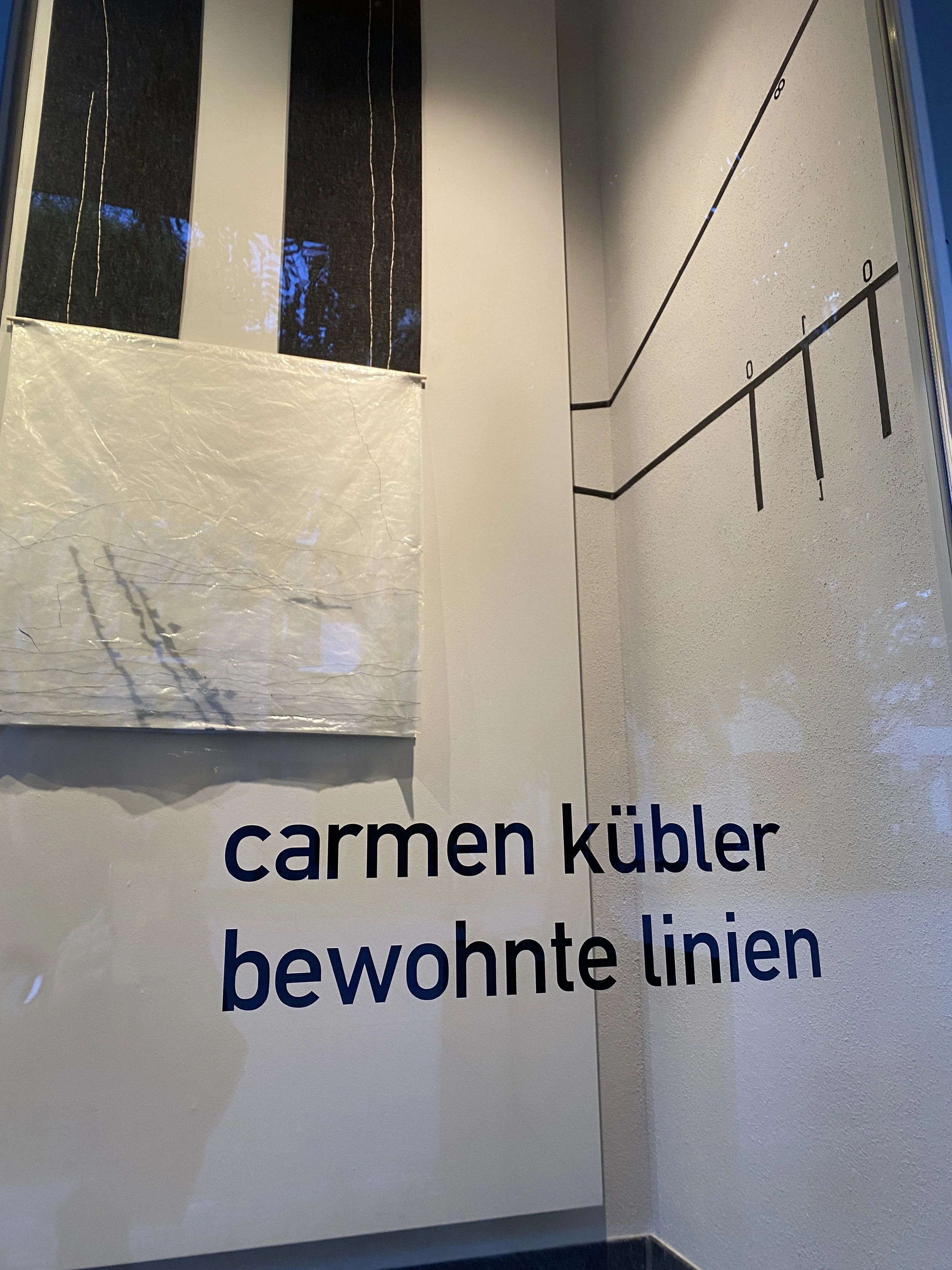Carmen Kübler ist eine Künstlerin, die nach ihren Ausflügen ins Objekthafte, immer wieder in die Zeichnung zurückfindet. Neben dem klassischen Stift auf Papier, zu dem sie regelmäßig zurückkehrt, kommt die Zeichnung in ihren Arbeiten auch in Form gestickter Linien auf verschiedene Materialien, durch Klebebänder direkt an die Wand oder auch mal geklebter Halme in den Raum. Auch die Trägermaterialien wandeln sich bei ihr und neben verschiedenen Papieren kommen Folien, Stoffe oder verschiedene Filze vor. Sie interessiert sich besonders für die Beschaffenheit des Materials in Kombination mit Nadel und Faden. Die Transparenz oder Dicke der Materialien ist für sie von Interesse und die verschiedenen Materialien stellt sie gerne gegenüber. Dadurch entstehen neue Gebilde und neue Beziehungen zwischen den Zeichnungen und Objekten.