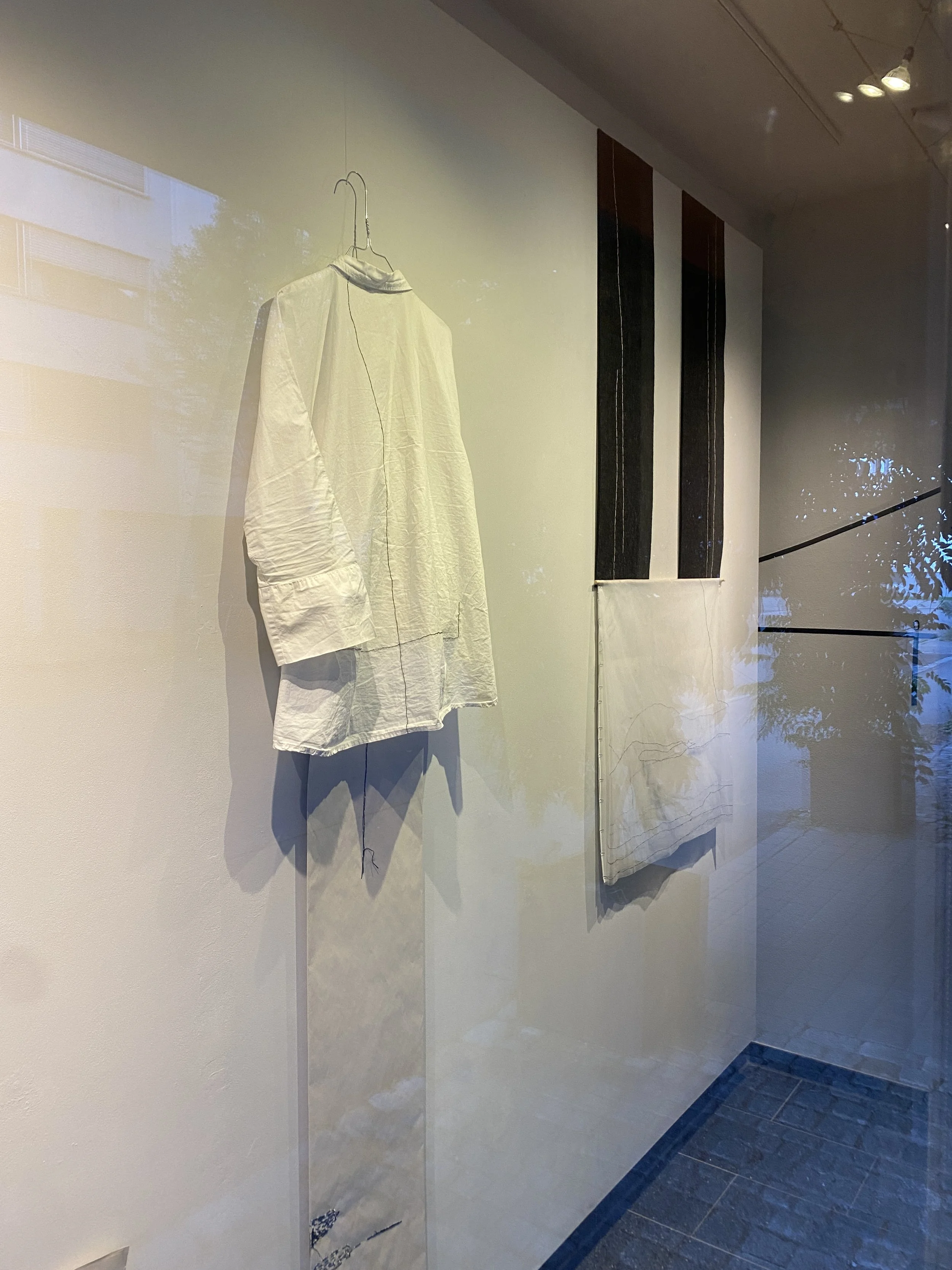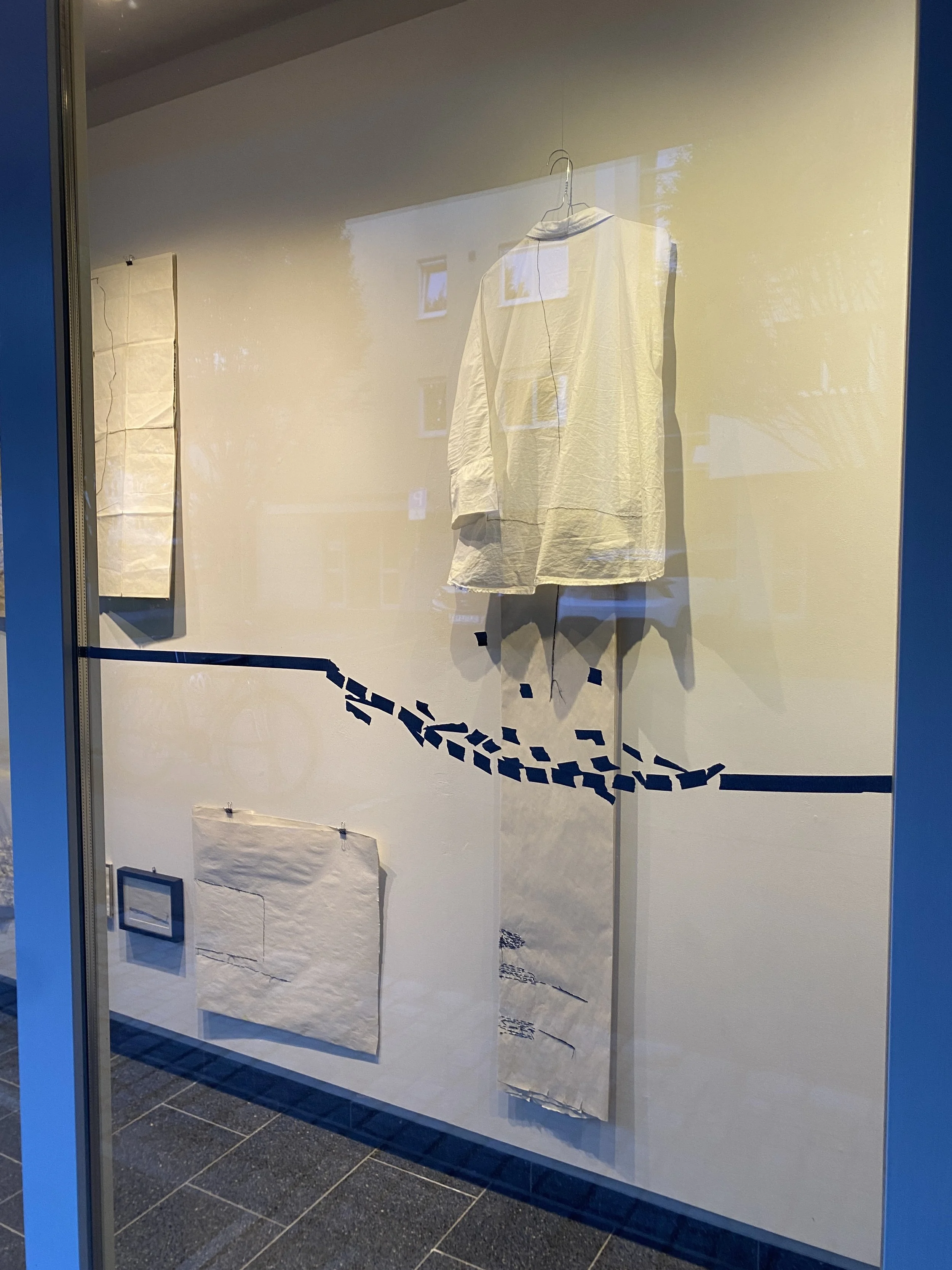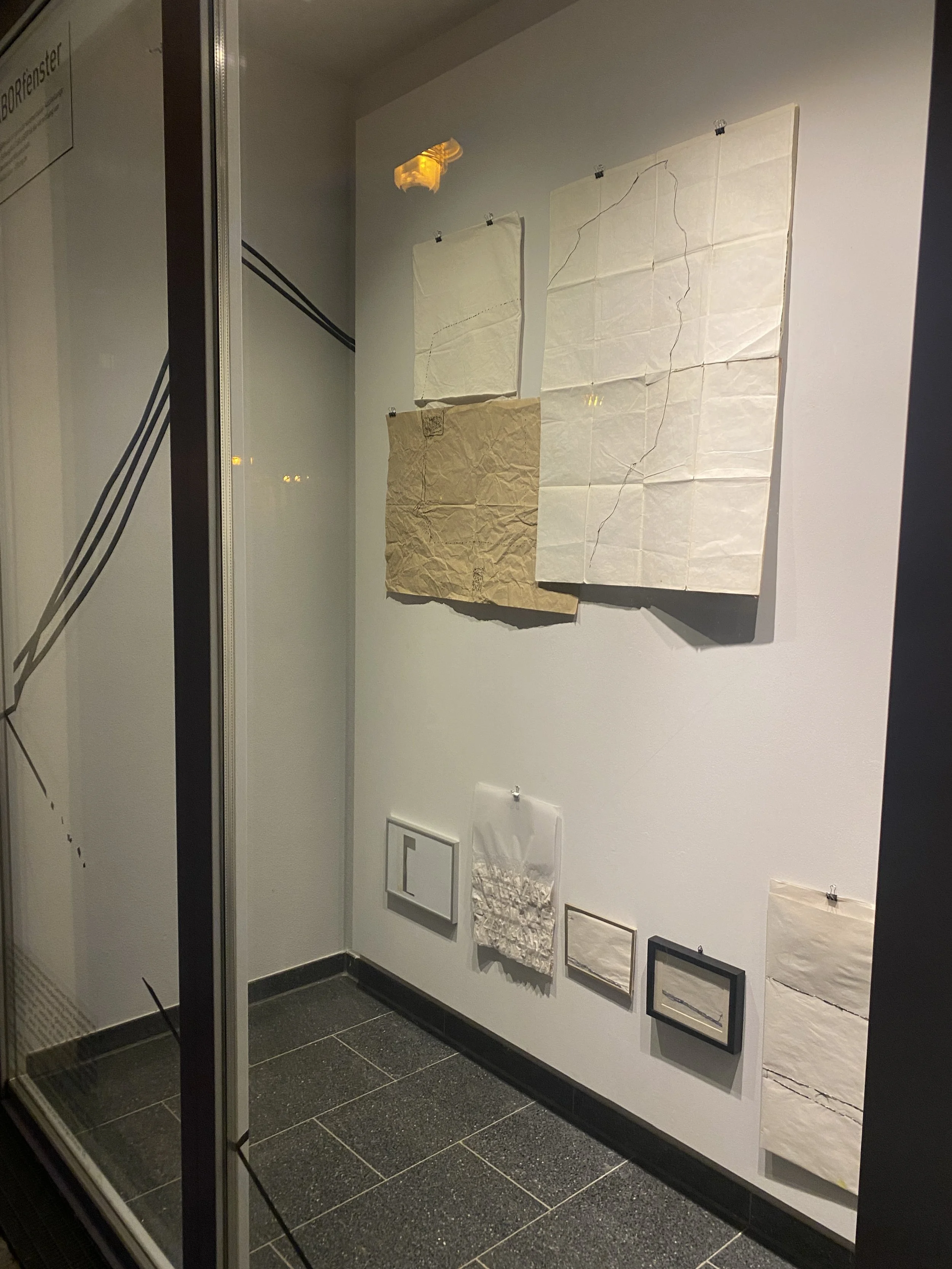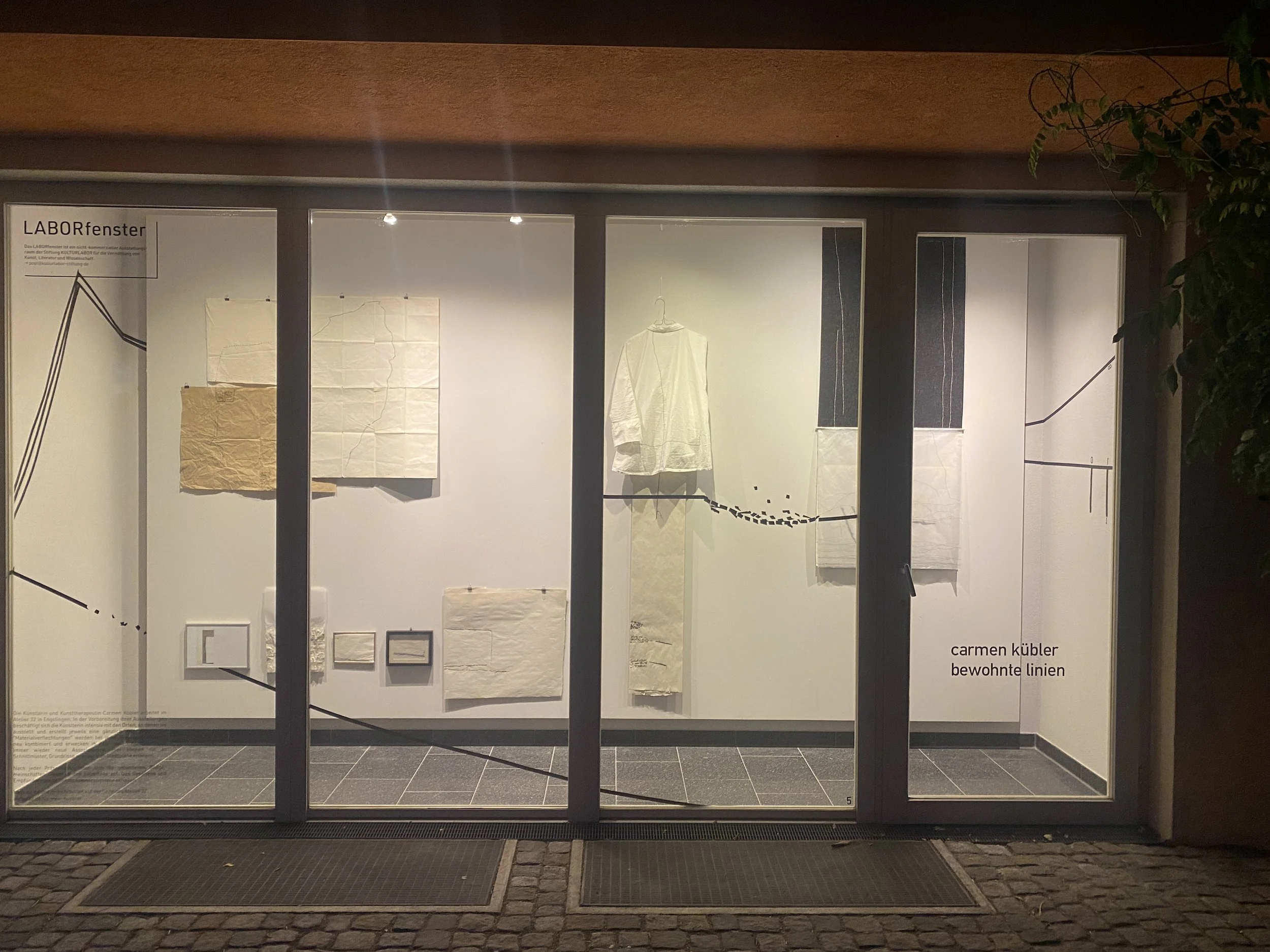 Die “Materialverflechtungen” im LABORfenster erinnern an Schnittmuster, Grundrisse oder manchmal auch an Stadtpläne. Diese Verflechtungen werden bei jeder der Ausstellungen von Carmen Kübler neu kombiniert und erwecken in ihren neuen Kombinationen immer wieder neue Assoziationen. In der Vorbereitung ihrer Ausstellungen beschäftigt sich die Künstlerin intensiv mit den Orten, an denen sie ausstellt und erstellt für jeden Ort eine gänzlich neue Arbeit. Nach jeder Präsentation lösen sich die gefundenen Paarungen und Bildgemeinschaften wieder in Einzelteile auf. Das Gesehene und Empfundene bleibt nur als Erinnerungsspur erhalten. Die einzelnen Zeichnungen werden wieder zum Rohstoff für neue Arbeiten und können in neuen Kontexten ganz neuen Interpretationen Raum lassen.