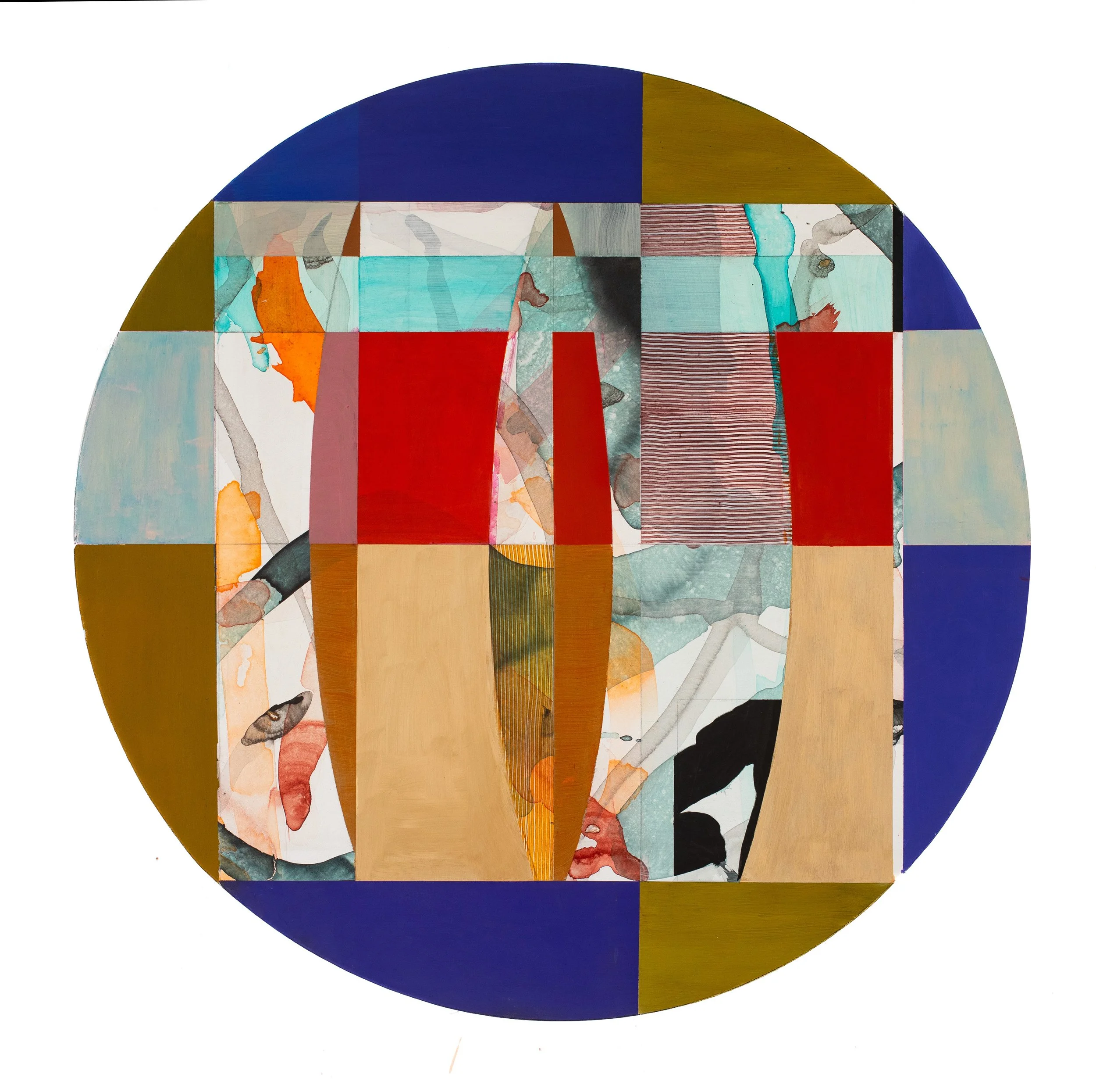 Konträre bildnerische Elemente miteinander zu kontrastieren, auszubalancieren und in ein Farbgefüge zu bringen. Strenge geometrische und deckende (opake) Farbsegmente überlagern leichte und transparente (opale) und amorphe Farbpartien.