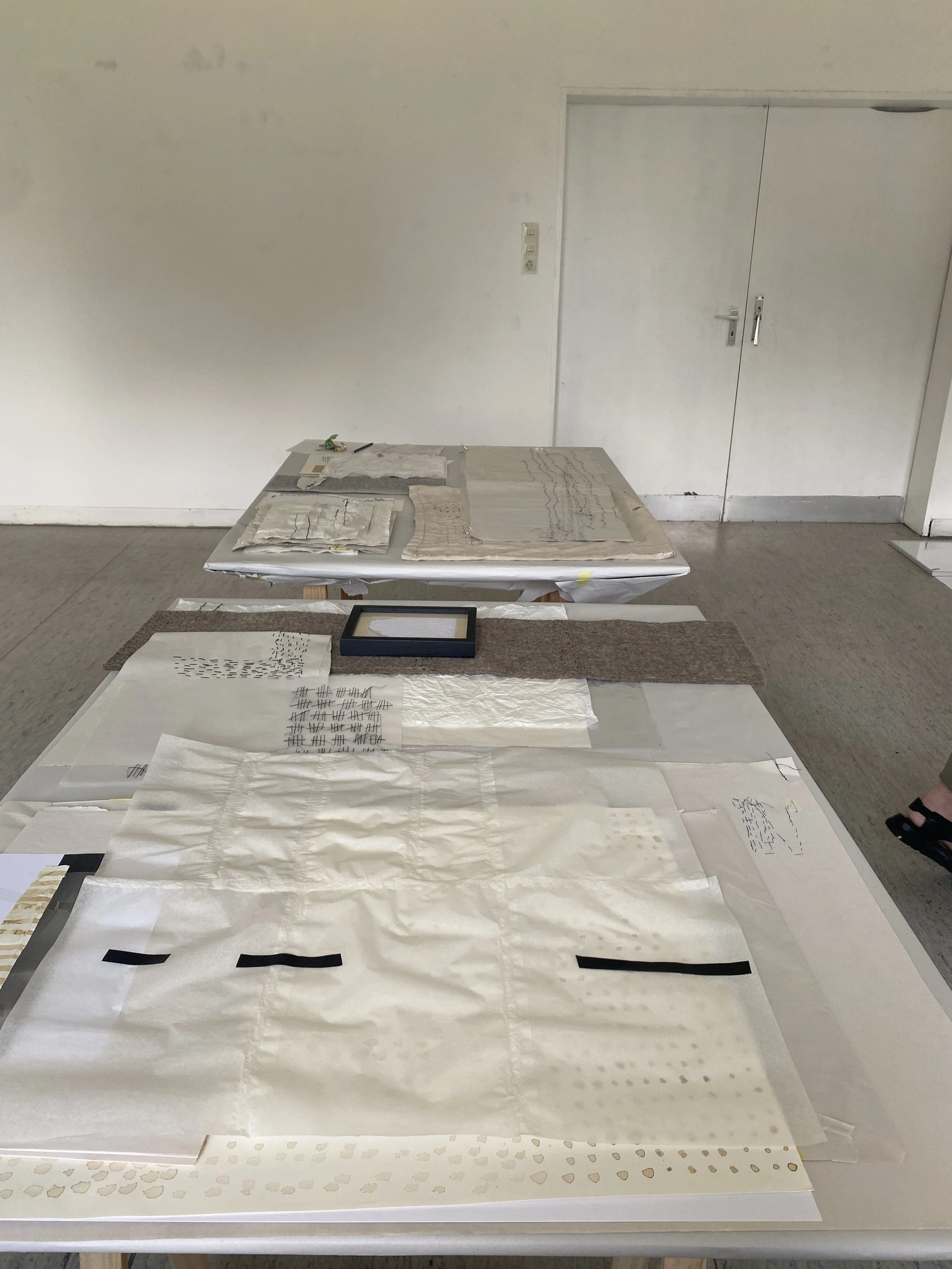Ja, der Raum ist sehr wichtig. Ein Atelier zu haben, in dem man sich ausbreiten kann und Dinge auch mal liegen lassen kann, in dem ich ungestört bin. Manchmal komme ich nur zum Lesen und Schreiben, um Notizen zu machen. Das ist aber etwas grundsätzlich anderes, als wenn ich zu Hause im Wohnzimmer sitzen würde. Ich bin jetzt zehn Jahre hier im Atelier 32 und ich mag meinen Raum sehr gerne.