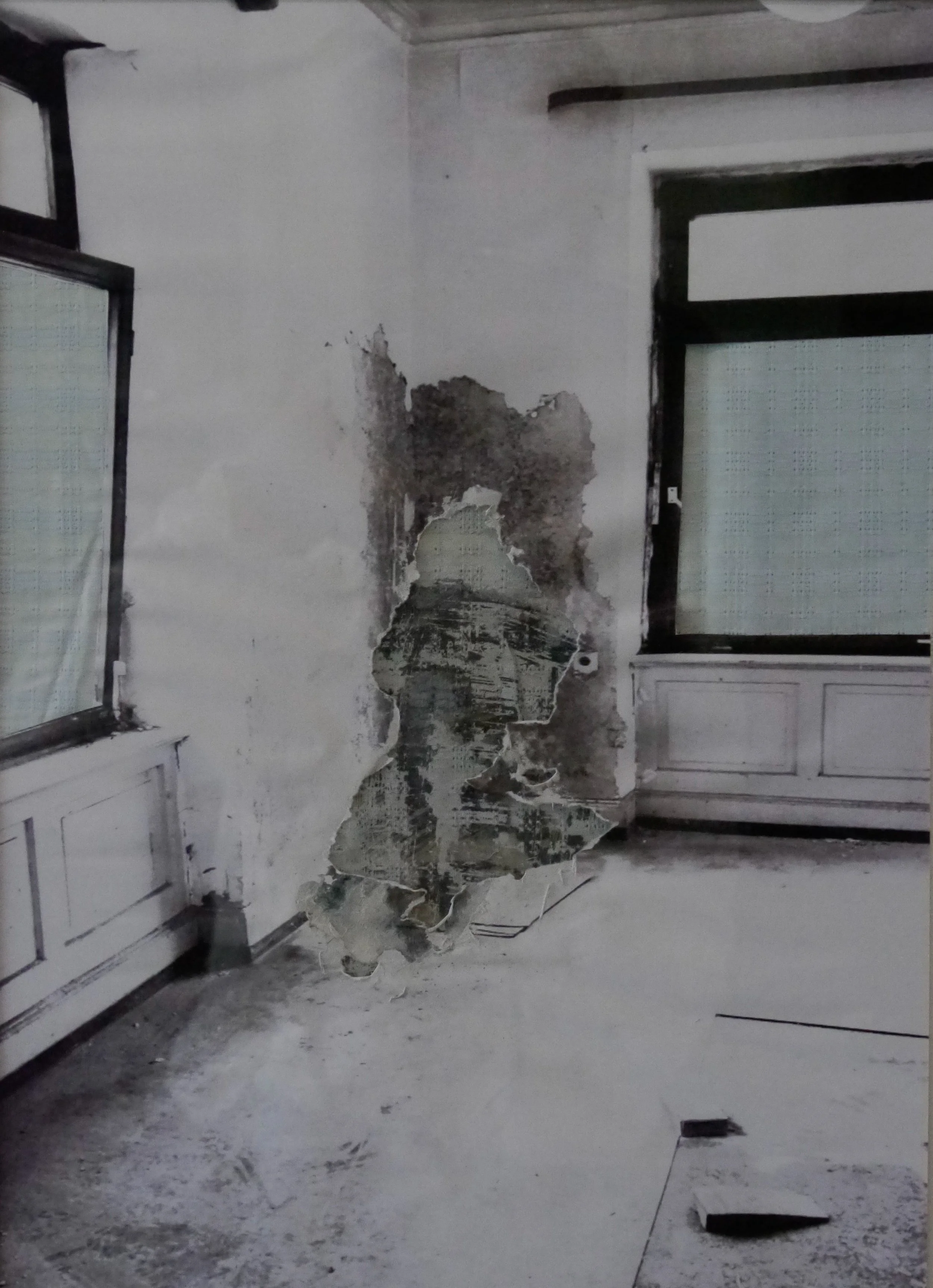 Meine letzte Ausstellung fand in einem alten Schulhaus statt. Ein Ort, der 150 Jahre als Schule genutzt worden ist. Also auch ne Geschichte hat, der 2 Weltkriege erlebt hat und auch Lazarett war zwischendurch. Heute erinnert nur noch wenig an eine ehemalige Schule, weil fast alles neu renoviert ist. Letztendlich hab ich dann mit Fotos aus der Renovierungszeit gearbeitet. Die Bilder, auf denen man die alten Balkenkonstruktionen der Räume gesehen hat, als die Räume noch ganz roh waren, fand ich interessant. Diese Zwischenstadien habe ich dann überstickt und mit anderen Materialien überarbeitet. Auch die Elemente Schrift und Zeilen habe ich einfließen lassen.