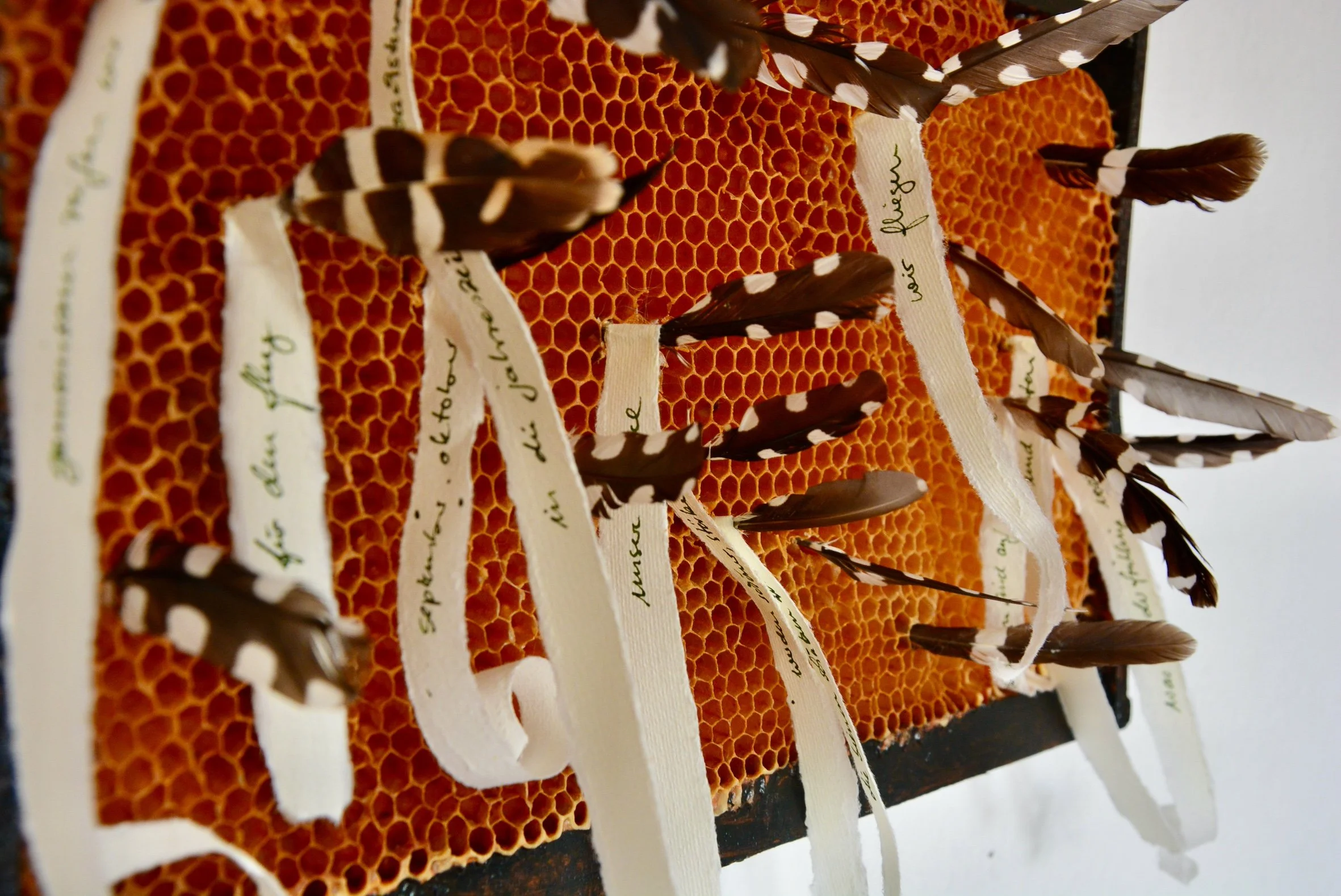 Ich habe auf dem Fernsehsender 3Sat eine Sendung über die Wiederansiedlung des Wiedehopfs im Wagram, einer Weinregion vor Wien, geschaut. Sie haben Manfred Eckenfeller interviewt, der den Wiedehopf dort angesiedelt hatte. Ich entschloss mich, ihn zu besuchen. Er schenkte mir Wiedehopffedern. Daraus entstanden die Arbeiten mit Bienenwaben, Texten und den Federn.
