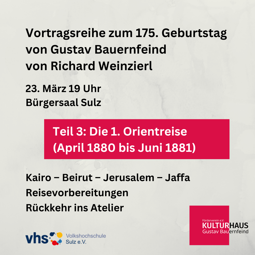 Anlässlich dieses Jubiläums wird Richard Weinzierl diese und andere Fragen beantworten. Anschaulich und lebendig zeigt er in 7 Vorträgen den Lebensweg des Sulzer Künstlers auf.
